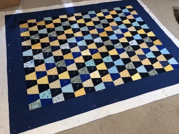 I also basted the blue tumbler quilt with batting and backing: