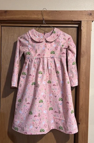 The bodice is lined. That was, by far, the hardest part of making this because the sleeves were attached and had to be rolled up between the neckline and shoulder of the body and lining—a la burrito method. Were I to do it again, I might consider changing the bodice lining to a facing. Otherwise, it was a quick sew, taking approximately one day. The fabric is a lovely flannel from Riley Blake. The dress needs a good steaming.
