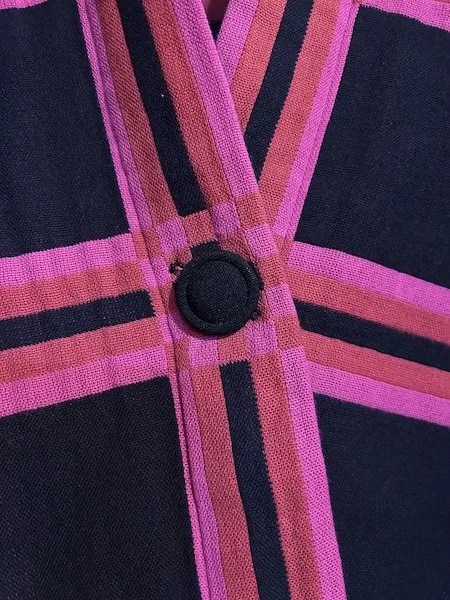 It looks good on me, the fabric is soft and cozy, the fit is close to perfect (could be longer), and it went together easily even in this fussy fabric. My only quibble with the pattern is that it doesn’t specify a vertical or a horizontal buttonhole. Help a girl out! I split the difference and went with one at an angle. And I found the perfect fabric-covered button in my vintage button stash:
