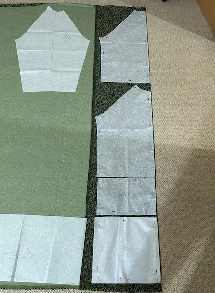 Usually, I cut on my cutting table, but I wanted to make absolutely sure that I could get all the pieces cut from this yardage, so I spread it out on the floor of our room and cut there. I lengthened the body by 3", which increased the yardage requirements.