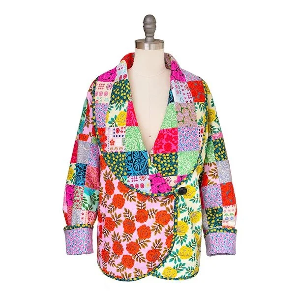 That oversized shawl collar is wonderful. I am a sucker for shawl collars. And the coat is long enough; I measured the pattern pieces against my BU quilted jacket. The instructions are for a lined coat and note that the outer patchwork should be quilted to the batting with a very lightweight backing fabric such as a batiste or lawn to reduce bulk. I think one could get away with just quilting the patchwork to the batting without a backing; the Bella Quilt Coat from byAnnie was done that way. The instructions also indicate that if using a vintage quilt and no lining, the seams will have to be finished in some way because they will be visible.