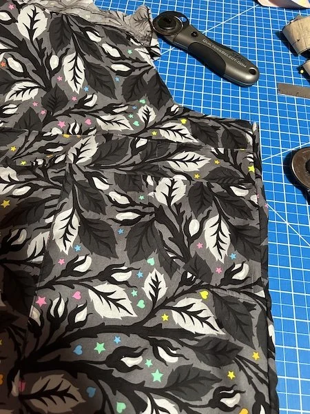 The fabric is a Tula Pink wideback. All that remains is to make and attach the shoulder straps, sew down the facing on the inside, and attach the belt loops on the back. I may try to finish it this morning.