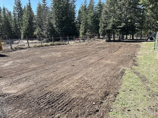 The stumps and herbs had been on that right side. Now it’s clear and smooth and I can get the tractor in and out if I need to. There used to be a bit of a swale in the middle and he filled that in. When he finished the grading, he moved a huge round bale of rotted hemp tow to the area and we spread that out. The black plastic will be put down on top of it.