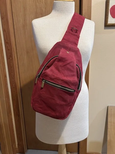 The perspective in this photo is way off for some reason. This looks like the size of a backpack on the dress form—and there is a similar pattern by this same company for a backpack just like this—but this is a smaller sling bag. I’ve been wanting something like this to carry to shows and other events. I would have used it last week at the quilt show in Spokane if it had been finished. 🫤
